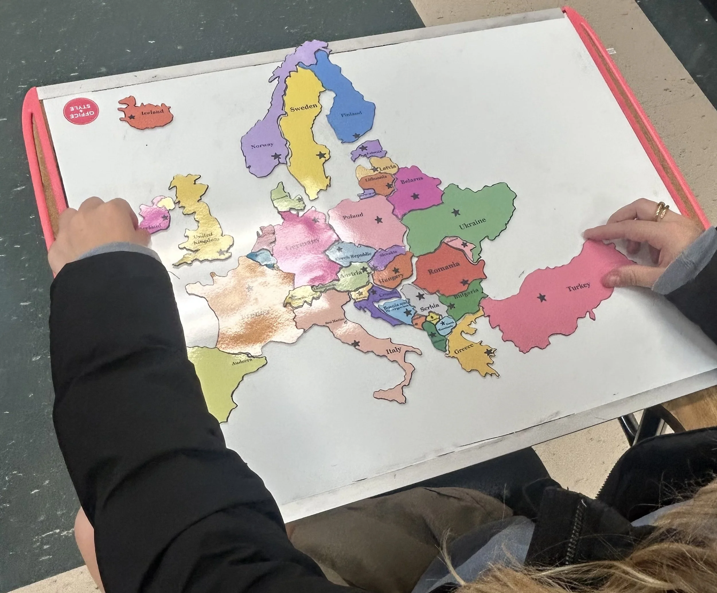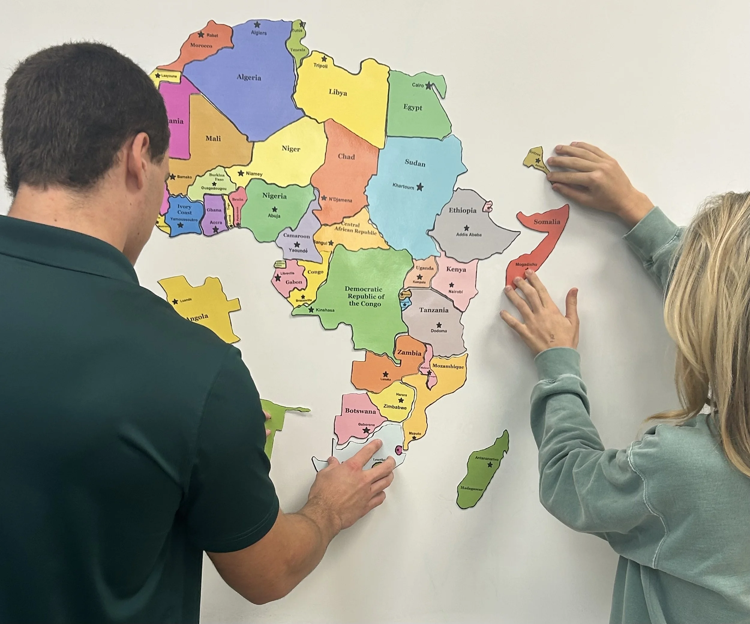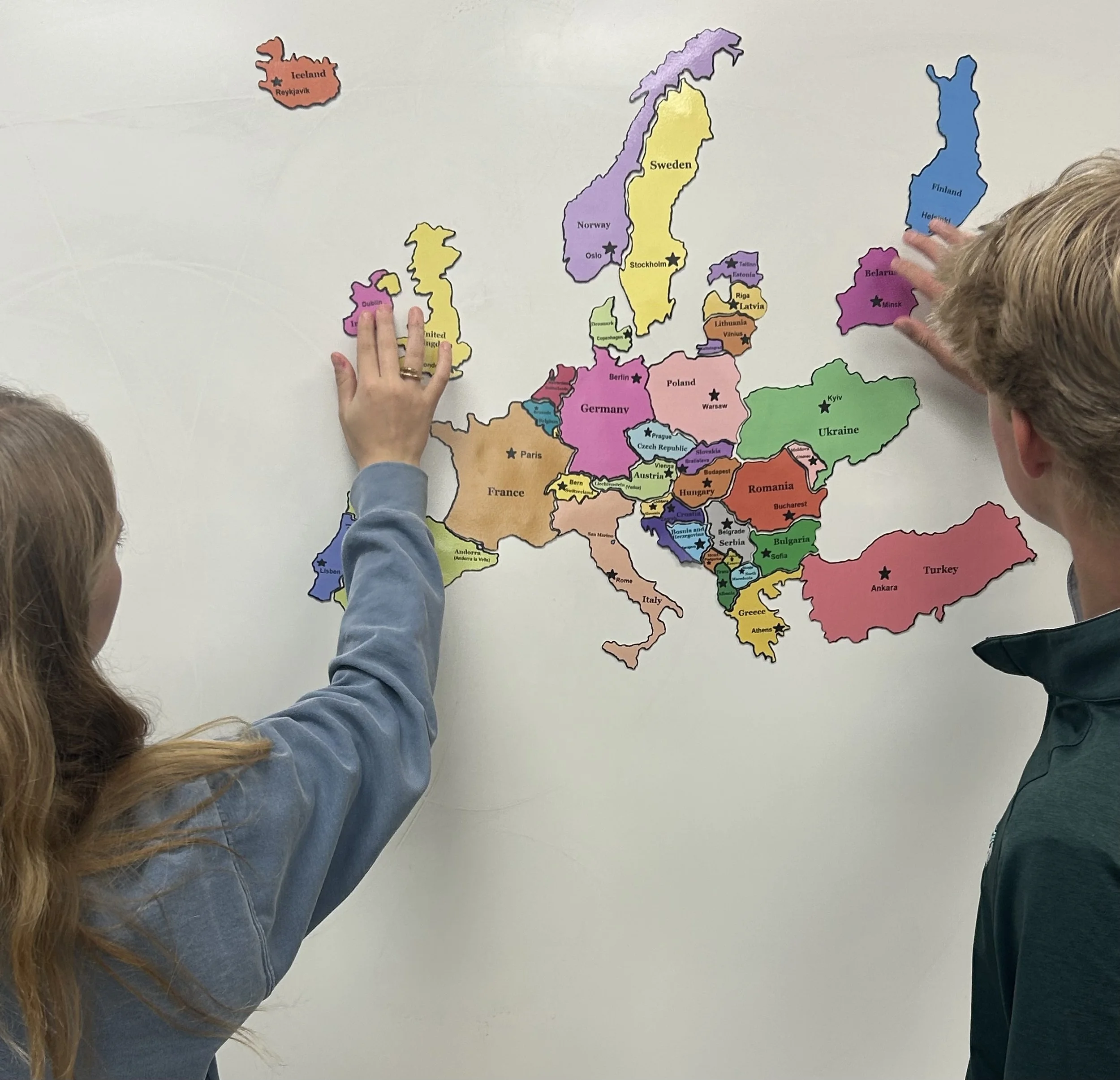EdMagZ® Geography Magnet Modules include a sequence of hands-on curricula designed to support geography and social studies instruction across a range of grade levels and courses. Modules G1–G5 focus on regional and continental geography, with students building maps of the United States, Europe, Central and South America, Africa, and Asia by placing individual state or country pieces to develop map skills, spatial reasoning, and geographic vocabulary. Each module is available with names and capitals printed, names only, capitals only, or completely unlabeled, allowing teachers to select the level of difficulty that best matches their students’ needs. Module G6: World Geography brings these skills together as students construct a complete world map, allowing them to examine global patterns, relative location, and scale across continents. Module G7: Pangaea extends geographic understanding through a dynamic model of continental drift, as students reconstruct Pangaea, track the movement of continents over time, and use fossil evidence to explore how Earth’s surface has changed. Across all modules, students build, label, move, and revise maps piece by piece, making geographic relationships and large-scale spatial patterns easier to understand, discuss, and explain.